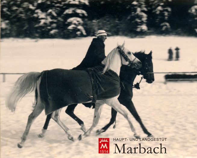 Hadif ox, ein Sohn des braunen Araberhengstes Halef ox der polnischen Araberzucht, mit dem damaligen Verwalter Hägele (Foto: Guttmann)