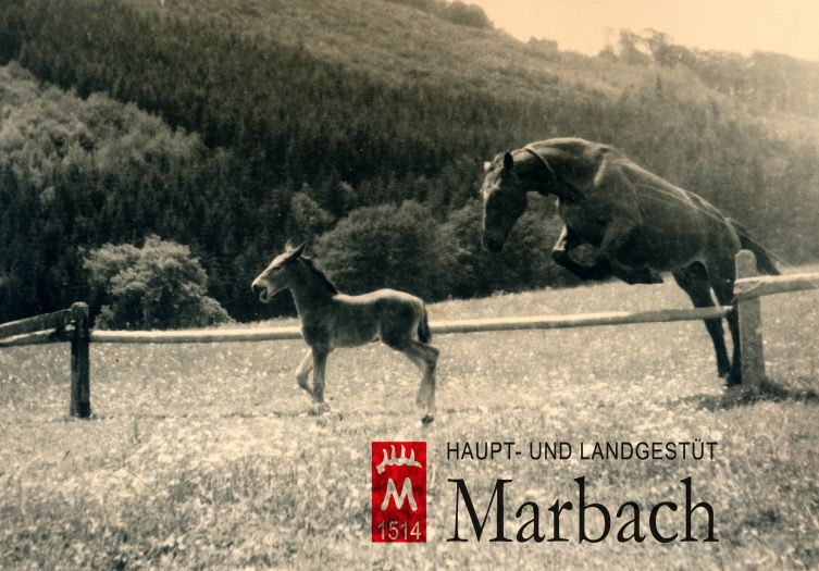 Julmond Anfang der 1960er unter Stutenmeister Georg Leuze oberhalb des Eichelesgarten mit einem Nachkommen jenseits des Zaunes (Foto: Guttmann)