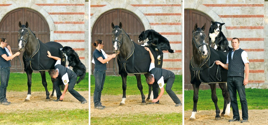 Marbacher Landbeschäler Fleiner (1986-2015) und Hundefreund Fly lernten Kunststücke bei Hauptsattelmeister Peter Friedrich (Fotos: Stephan Kube)