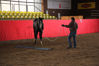 Die Teilnehmer lernen mehr über die einzelnen Elemente der Bodenarbeit, vom theoretischen Hintergrund über das Führtraining bis hin zu Gelassenheits- und Geschicklichkeitstraining. Alle Teilnehmer sind mit großem Eifer dabei!