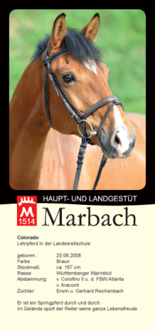 Interessierte finden ab sofort die Lehrpferde der Landesreitschule Marbach im Internet. Die 27 Pferde werden mit Bild und kurzer Beschreibung in Seckbriefen, die auch heruntergeladen werden können, vorgestellt. Lehrgangsteilnehmer können sich nun eine Erinnerung an ihre Begleiter in den Trainer- und Reitabzeichenlehrgängen der Landesreitschule holen.