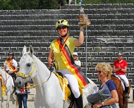 Nach 2013 und 2015, haben Melanie Arnold aus Kirchheim/Teck und Sevinc nun in Marbach zum dritten Mal den deutschen Meisterschaftstitel geholt. Für Sevinc war es außerdem ein "Heimsieg", ist sie doch in Marbach geboren! Sie entstammt dem rund 200-Jahre-alten Hengststamm des Bairactar und der ebenso alten Stutenlinie der Murana I. Melanie Arnold zählt zu den erfahrendsten und erfolchreichsten deutschen Distanzreiterinnen. Sie nahm 1993 zum ersten Mal an diesem Wettbewerb teil und errang seither 5 x Gold, 2 x Silber und 2 x Bronze. Dreimal war sie auf Weltmeisterschaften, zweimal auf Europameisterschaften dabei.