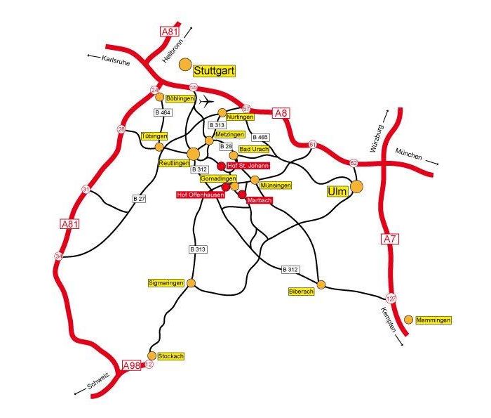 Ganztägig erreichbare Lademöglichkeiten, Typ 2, finden Sie auf dem Parkplatz am Ortseingang von Marbach (bei der Abzweigung nach Ödenwaldstetten). Navigationshilfe (googlemaps): Ladesäulen Marbach