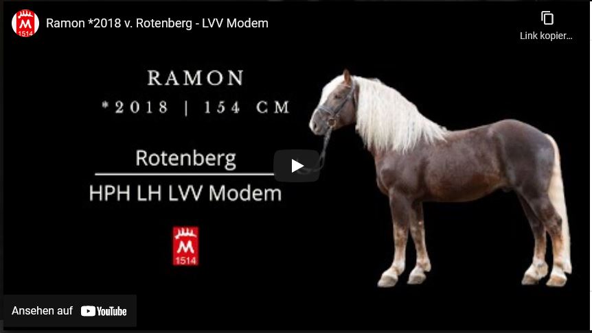 Unkompliziert und gangstark: Ramon ist ein weit entwickelter, mit großen Körperpartien und kräftigem Fundament ausgestatteter Hengst. Er überzeugt in der täglichen Arbeit wie bereits auf der Körung mit gutem, deutlich überfußenden Schreiten und fleißigem elastischen Trab. Sein ausgeglichenes Interieur und freundlicher Charakter runden sein unkompliziertes Wesen ab. Seine leistungsgeprüfte und prämierte Mutter geht auf den Stutenstamm der Flora von Audax zurück, aus direkter Verwandtschaft stammt Landbeschäler Maitanz.