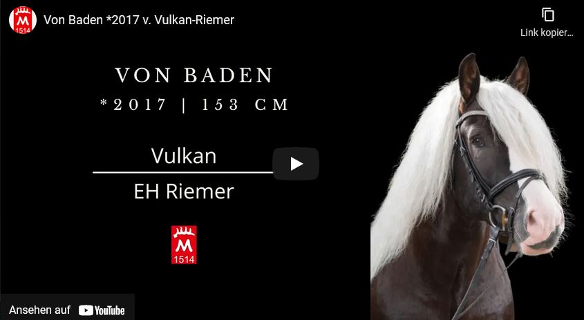 Von Baden ist Leistungshengst und der erste Sohn des Vulkan, welcher durch seinen überragenden Fohlenjahrgang 2017 auf sich aufmerksam machte. Seine Mutter St.Pr./ L.St. Natascha Rosalie stammt aus der erfolgreichen Stutenfamilie der Elitestute Märie. Sie war Leistungsprüfungssiegerin der LP 2012 mit einer Gesamtnote von 8,48 und nahm zweimal an der Bundeskaltblutschau in Berlin teil. Seit letztem Jahr hat sie zwei gekörte Söhne. Bei der Körung 2019 erreichte Von Baden den Reservesieg und wurde zudem mit der Junghengstprämie ausgezeichnet. Im Körkommentar wurde der Hengst als Junghengst mit einem sehr auffällig guten Exterieur, harmonisch konstruiert und mit guter Körperdrittelung beschrieben. Im September 2020 absolvierte er die Hengstleistungsprüfung mit einer Gesamtwertung von 7,93. Besonders hervorzuheben ist hier die überragende Interieurnote von 8,43 und die Bewertung des Schritts mit 9,0. Im Schritt zeigt er sich mit klarem Takt, fleißig, raumgreifend und gut unter den Schwerpunkt fußend. Der schöne Rasseadel dieses Hengstes wird durch seine noble Jacke und das helle Langhaar besonders hervorgehoben.
