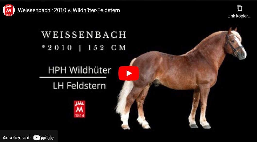 Körsieger 2012: Weissenbach ist ein Sohn von Wildhüter aus der Staatsprämienstute Resi von Feldstern. Schon bei der Körung fiel dieser bewegungs- und typstarke Hengst als Ebenbild seines in großem Format stehenden Vater Wildhüter auf, der selbst 2004 Körungssieger war. Seine Arbeitsmotivation wurde mit hervorragenden Noten im Fahren mit 8,38 sowie im Ziehen mit 8,83 belohnt. Mit seiner Gesamtnote von 8,65 gewann er souverän die Hengstleistungsprüfung 2013 im Ziehen und Fahren. Auch unter dem Sattel lässt er keine Wünsche offen. Mit Motivation und Köpfchen, versucht er es seinem Reiter immer recht zu machen. Das gut gewinkelte Hinterbein unterstützt hierbei den fleißigen und leitfüßigen Trab, die schöne Vorhandaktion unterstreicht dabei den Karosserietyp. Der Schritt beeindruckt durch viel vorwärts Tendenz und zeigt, dass Weissenbach das Bewegungstalent seines Vaters Wildhüter, der sowohl unter dem Sattel als auch am langen Zügel beeindruckt, geerbt haben zu scheint. Unter Weissenbachs Nachkommen, sticht besonders der gekörte Sohn Winzent hervor.